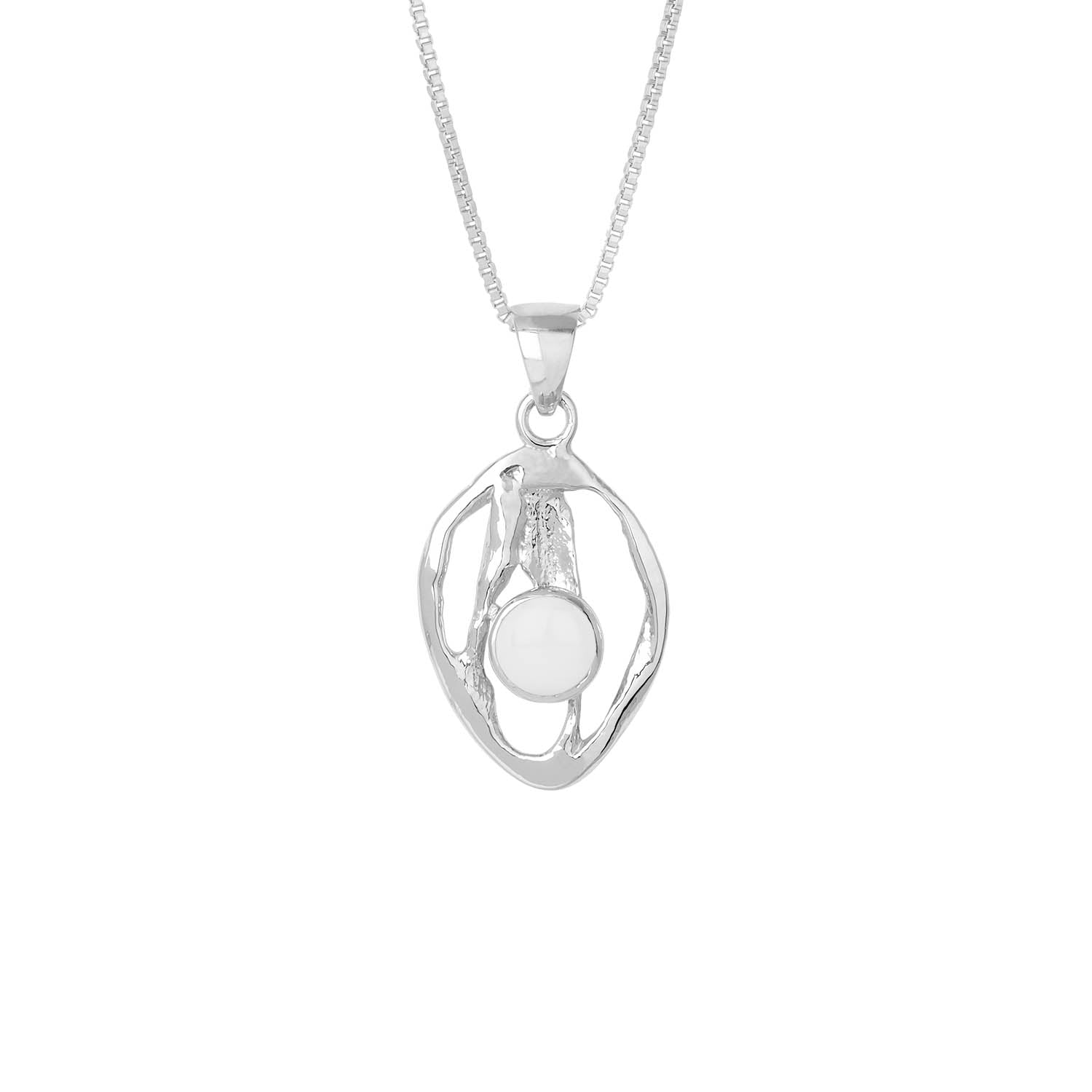 Hálsmenið er handsmíðað úr rhodiumhúðuðu silfri með íslenskum kalsidon steini.
