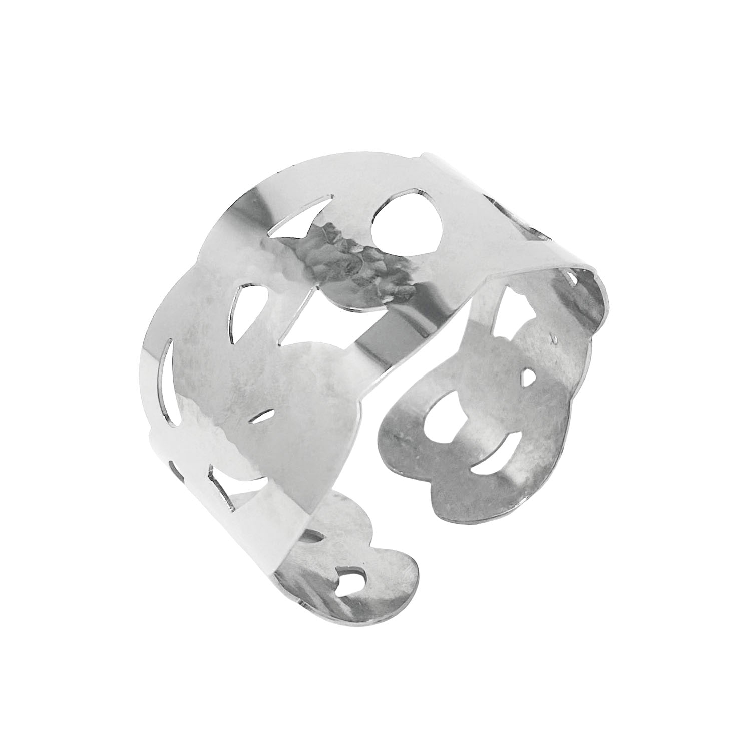 Handsmíðað armband úr eðalstáli með hamraðri áferð. Armbandið er hægt að laga að breidd úlnliðs. Armbandið er einnig hægt að nota yfir síðerma flík.