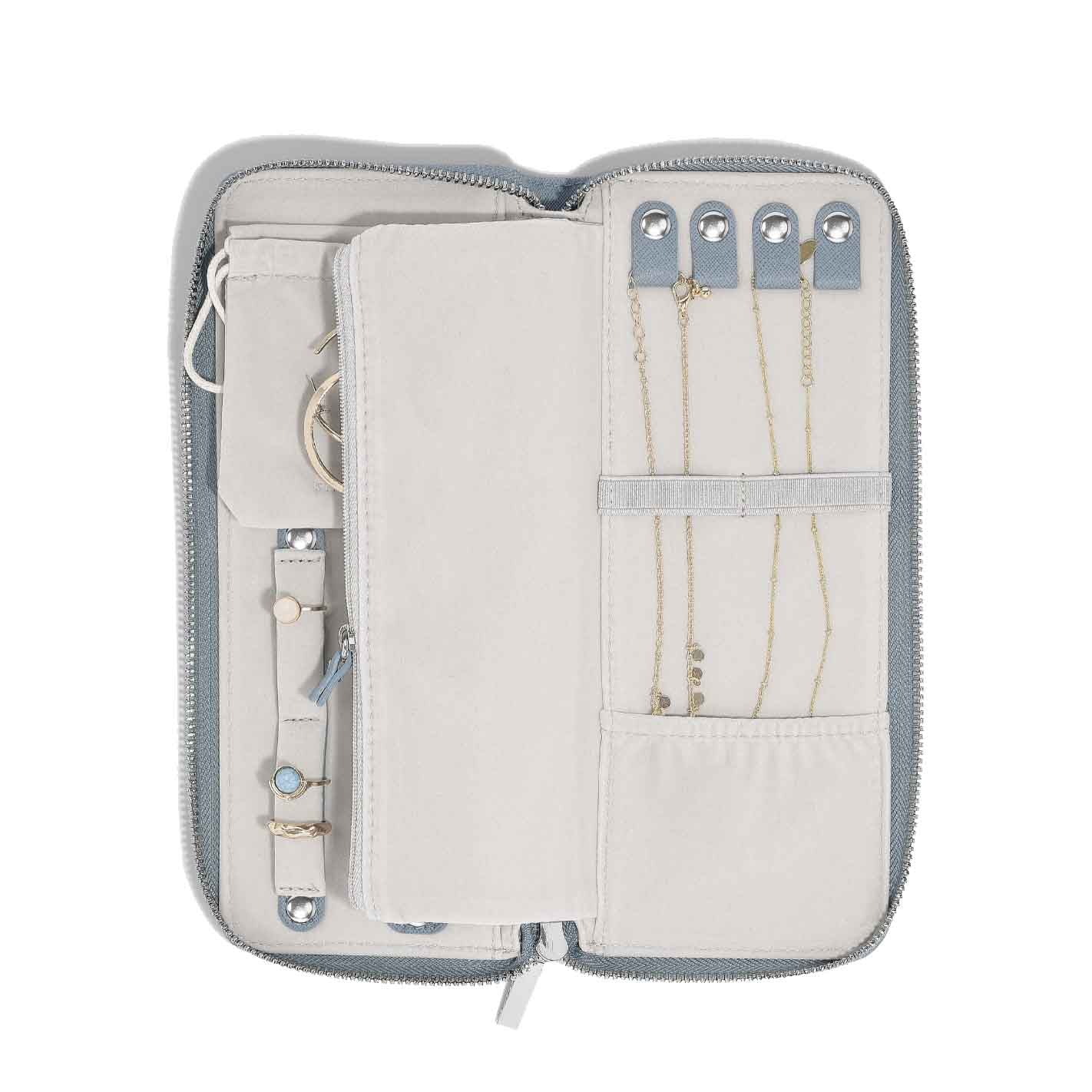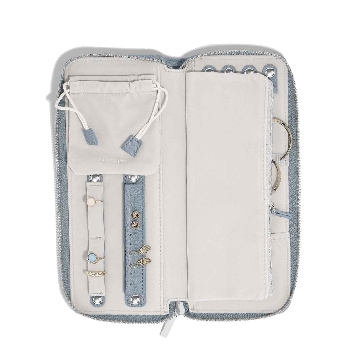 Ferðaskrínið hefur að geyma sérstakt pláss fyrir eyrnalokka, hringa, armbönd og hálsmen. Þar að auki er poki fyrir smáa skartgripi og einnig er vasi fyrir enn fleiri hluti. Það fer lítið fyrir skríninu í farangurstöskunni. Hafðu allt í skipulegi í fríinu, bústaðnum, eða heima.